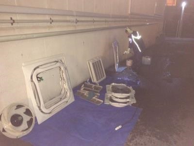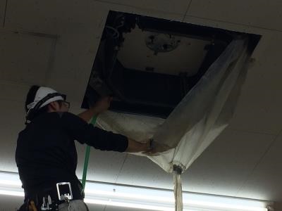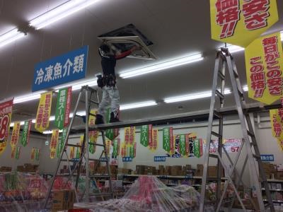 夜間作業。 天井カセット4方向9台と室外機10台の洗浄工事でした。 商品を陳列したままでの作業なので、養生にはかなり気を配りながらの作業でした。