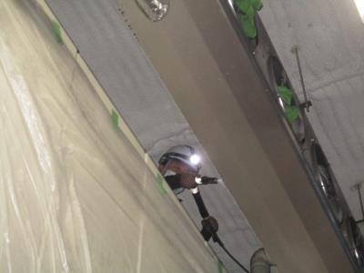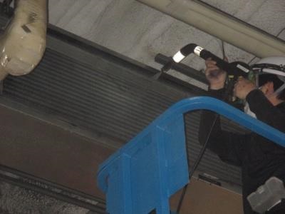 某食品倉庫の高所作業車に乗っての洗浄作業です。