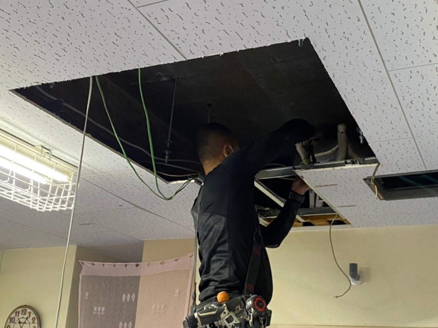 天吊り型エアコンから天井カセット4方向型への入替工事でした。